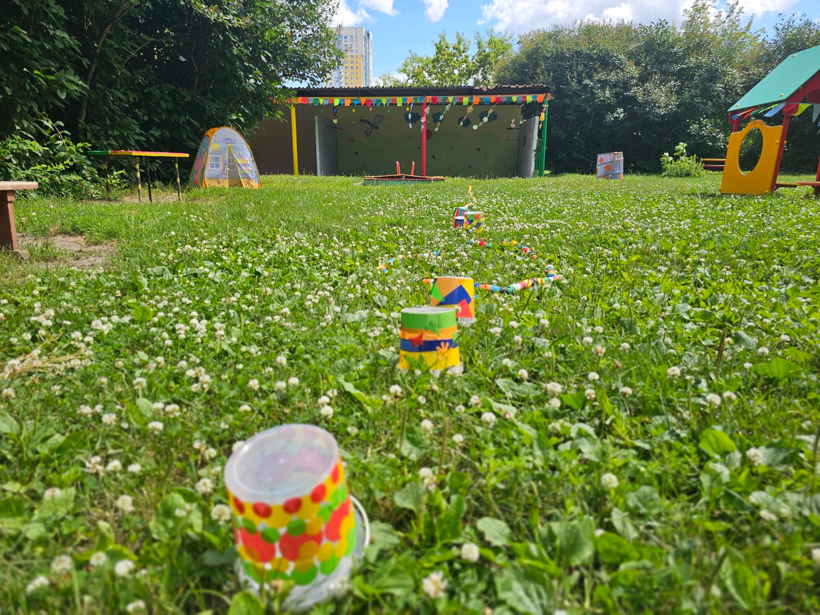 – 14 прогулочных участков для детей. Для защиты детей от солнца и осадков на территории каждой прогулочной площадки установлены теневые навесы.  Прогулочные площадки оборудованы малыми игровыми формами в соответствии с возрастом.
