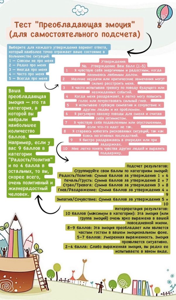 Распознавать и отслеживать своё эмоциональное состояние полезно не только детям, но и взрослым, для этого предлагаем вам пройти тест: «Преобладающая эмоция».