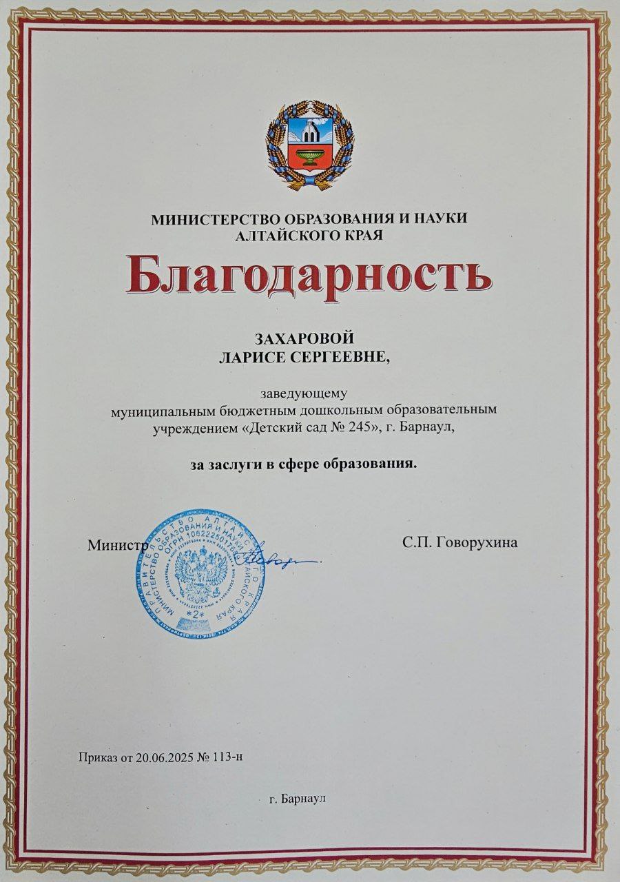 Замечательно, что заслуги нашего заведующего МБДОУ «Детский сад №245» Захаровой Ларисы Сергеевны оценены по достоинству👍