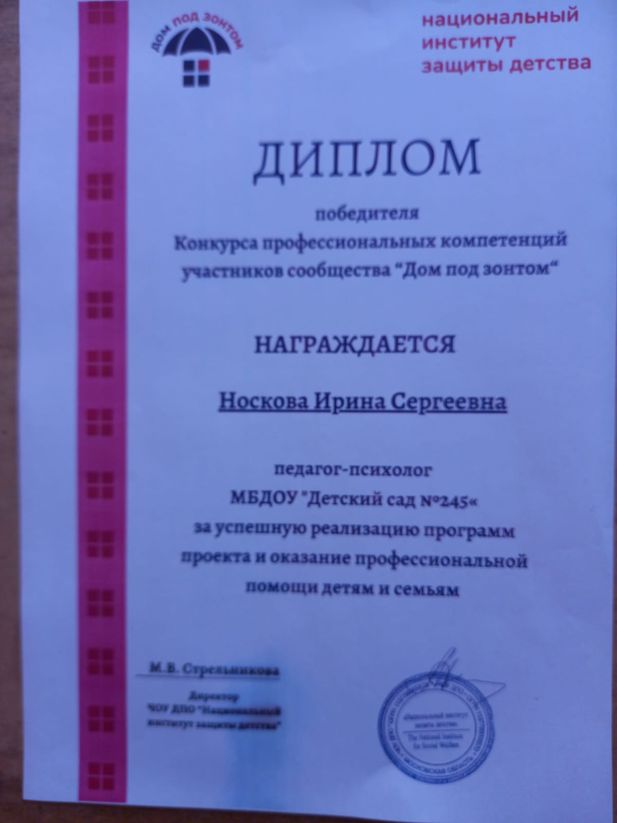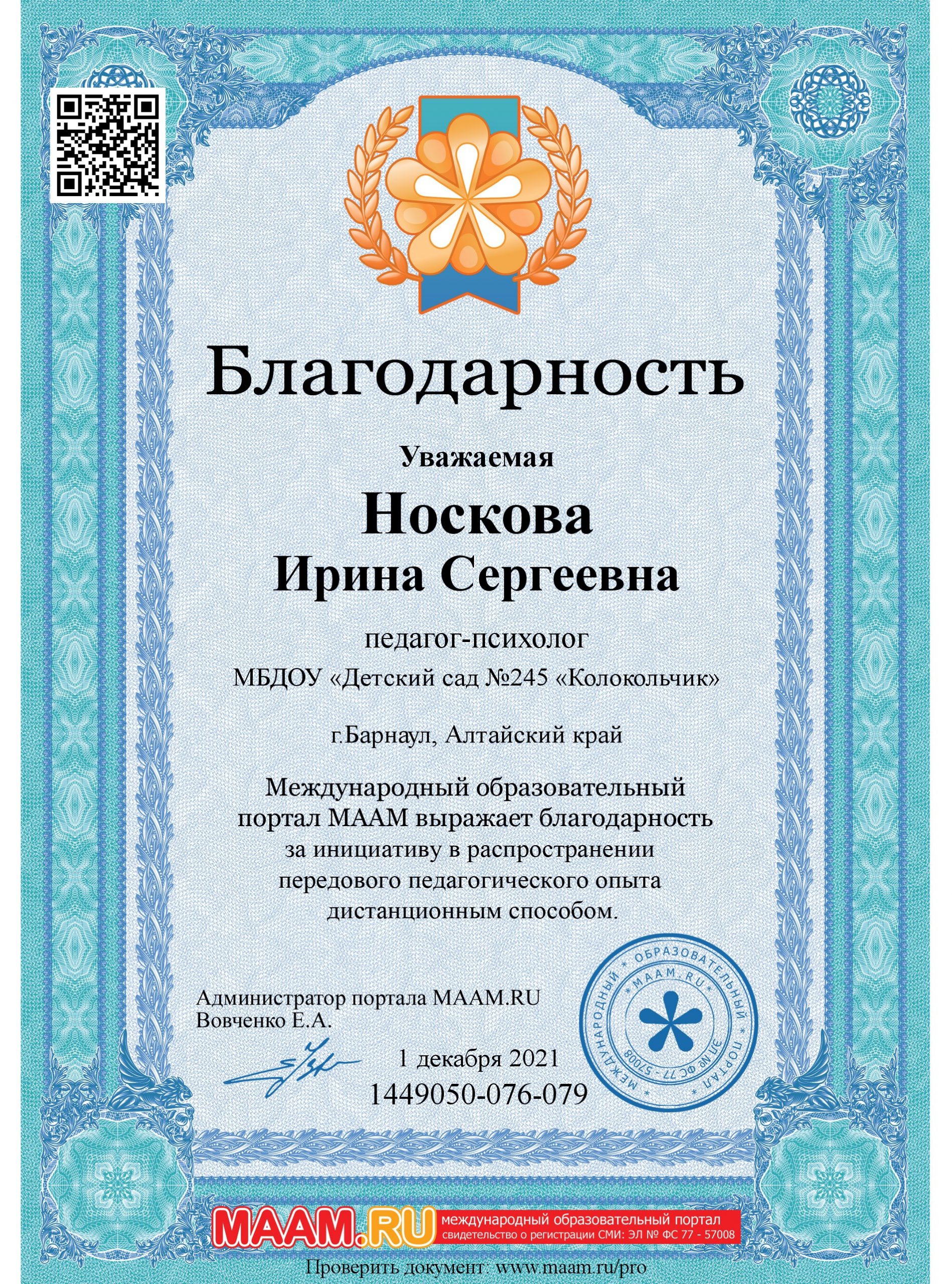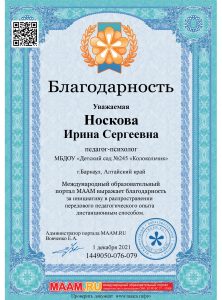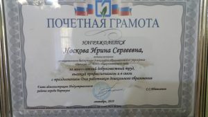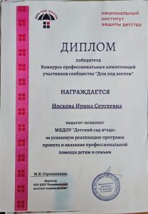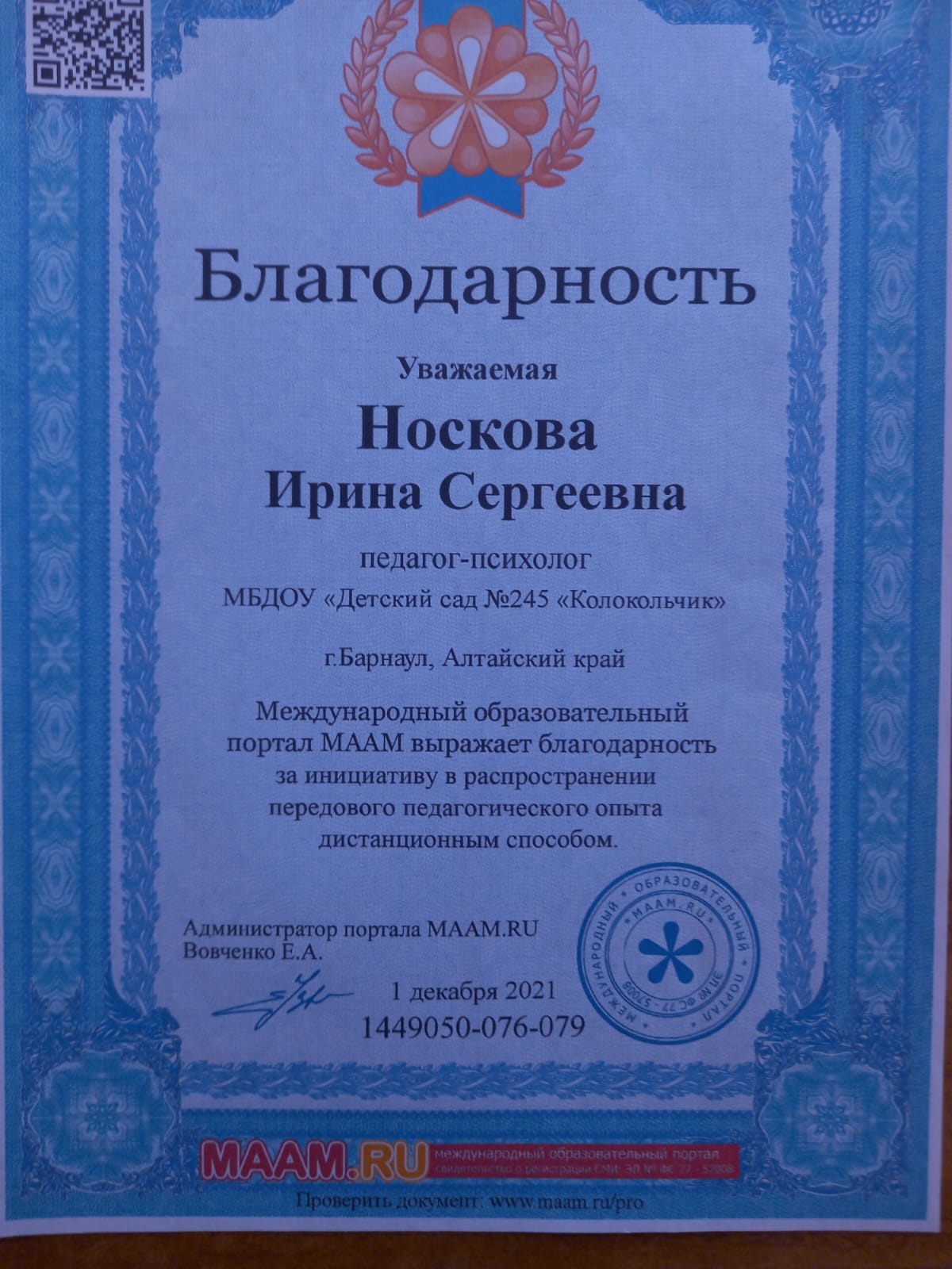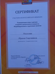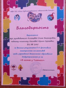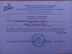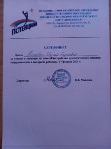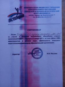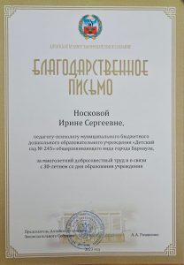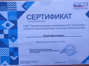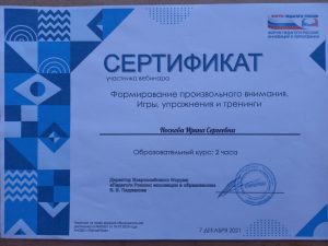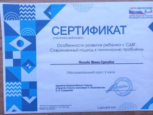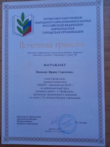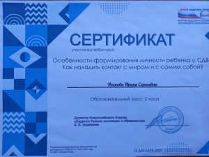 Диплом «За актуальность и социальную значимость тематики»Сертификат участника Президентской программы развития Гражданского общества «Система государственно-общественного управления в образовательной организации «Благодарность за высокие результаты в VI фестивале театральных коллективов среди учреждений дошкольного образования Индустриального районаДиплом за II место во всероссийском тестировании «Социальная адаптация детей дошкольного возраста»Почетная грамота за многолетний добросовестный труд, высокий профессионализм и в связи с празднованием Для работника дошкольного образованияСертификат, подтверждающий прохождение всероссийского тестирования по теме «Формирование сотруднических отношений между родителями и педагогами»Диплом Гран-При за высокие результаты в VI фестивале театральных коллективов среди учреждений дошкольного образования Индустриального районаСправка, подтверждающая присутствие на семинаре по теме: «Документация педагога-психолога МДОО»Сертификат участника онлайн марафона «Каждый воспитатель и учитель — психолог «Справка, подтверждающая присутствие на заседании методического объединения по теме : «Анализ работы МО педагогов-психологов МДОО за 2018-2019гг»Грамота за спортивные достижения в эстафете посвященной «НЕДЕЛЕ ЗДОРОВЬЯ»Сертификат участника вебинара «Особенности развития ребенка с СДВГ. Современный подход к пониманию проблемы»Справка, подтверждающая присутствие на семинаре-практикуме по теме: «Психолого-педагогической сопровождение детей(в том числе с ОВЗ)»Свидетельство о регистрации на международном образовательном портале Маам и является участников сетевого педагогического сообщества.Сертификат участника вебинара «Формирование произвольного внимания. Игры, упражнения и тренинги»Сертификат участника вебинара «Воспитание волевых качеств и самоконтроля у детей с СДВГ»Сертификат за участие в заседании методического объединения по теме: «Дети с ОВЗ, инвалидность в детском саду», «Деятельность психолого-педагогического консилиума образовательной организации»Сертификат за участие в семинаре по теме: «Расстройство аутистического спектра: сотрудничество в интересах ребенка»Справка слушателя за участие в онлайн методическом объединения по теме: «Реализация проектной деятельности с воспитанниками»Сертификат за участие в семинаре по теме: «Расстройство аутистического спектра или характер: как разграничить?»Сертификат участника онлайн-марафона «Сказотерапия»Справка слушателя за участие в онлайн семинаре по теме: «Организация работы ДОО с неблагополучными семьями»Диплом участника образовательного курса. Вебинар «Игры для психокоррекции недостатков личностного развития гиперактивных дошкольников»Сертификат, подтверждающий участие в установочном семинаре по итогам VI районного фестиваля детских театральных коллективов «В гостях у Тимошки»Благодарность за инициативу в распространении передового педагогического опыта дистанционным способом.