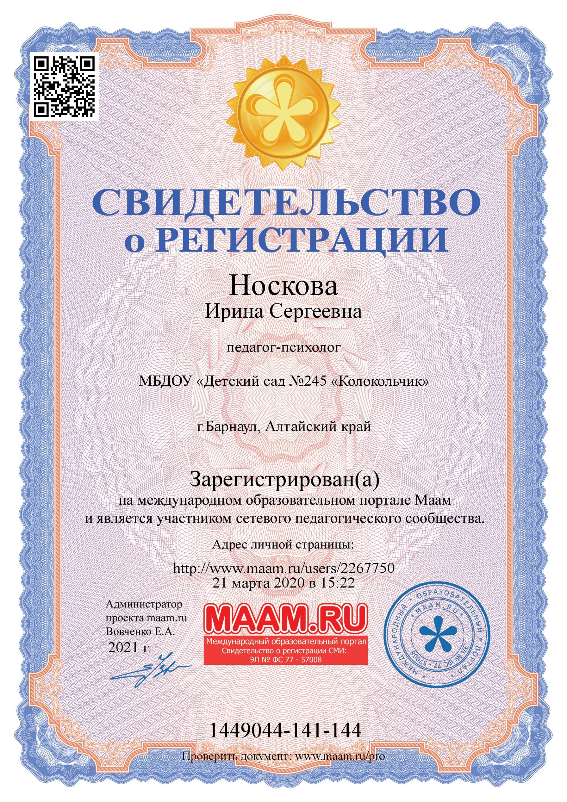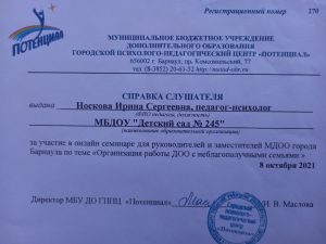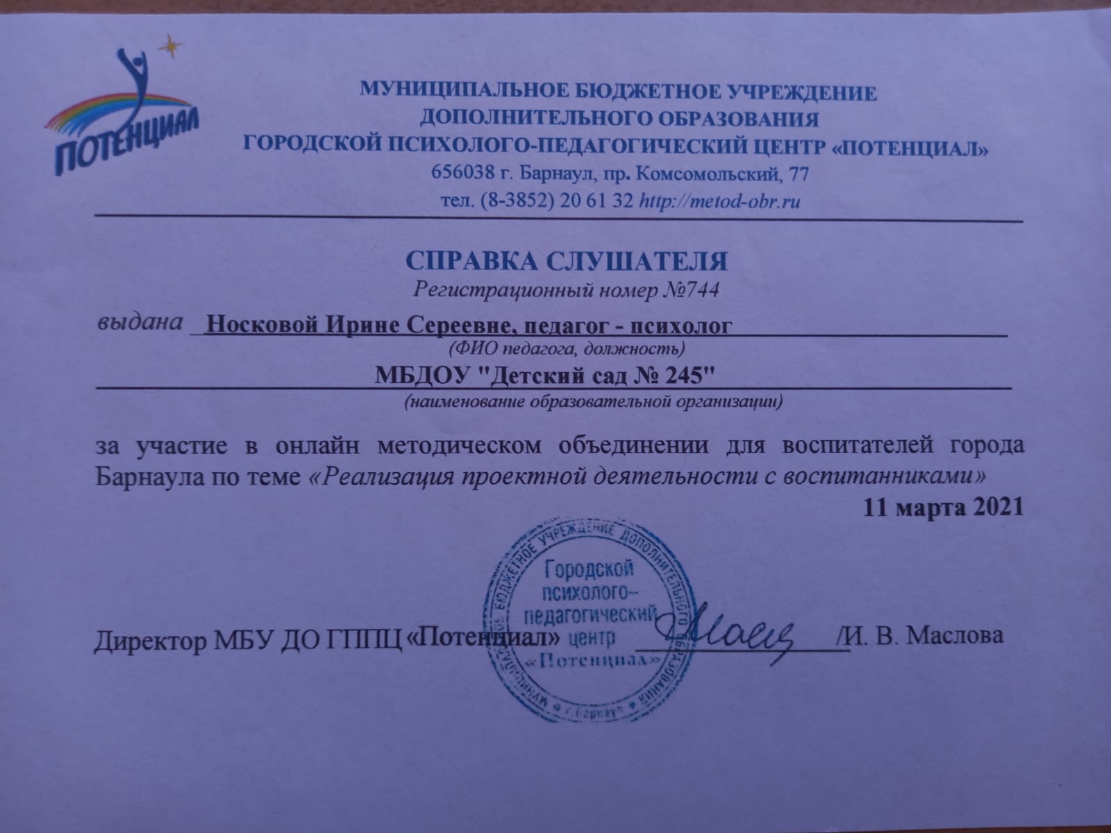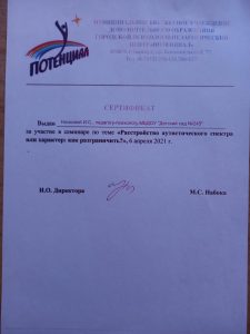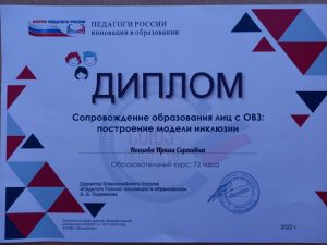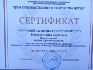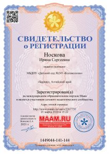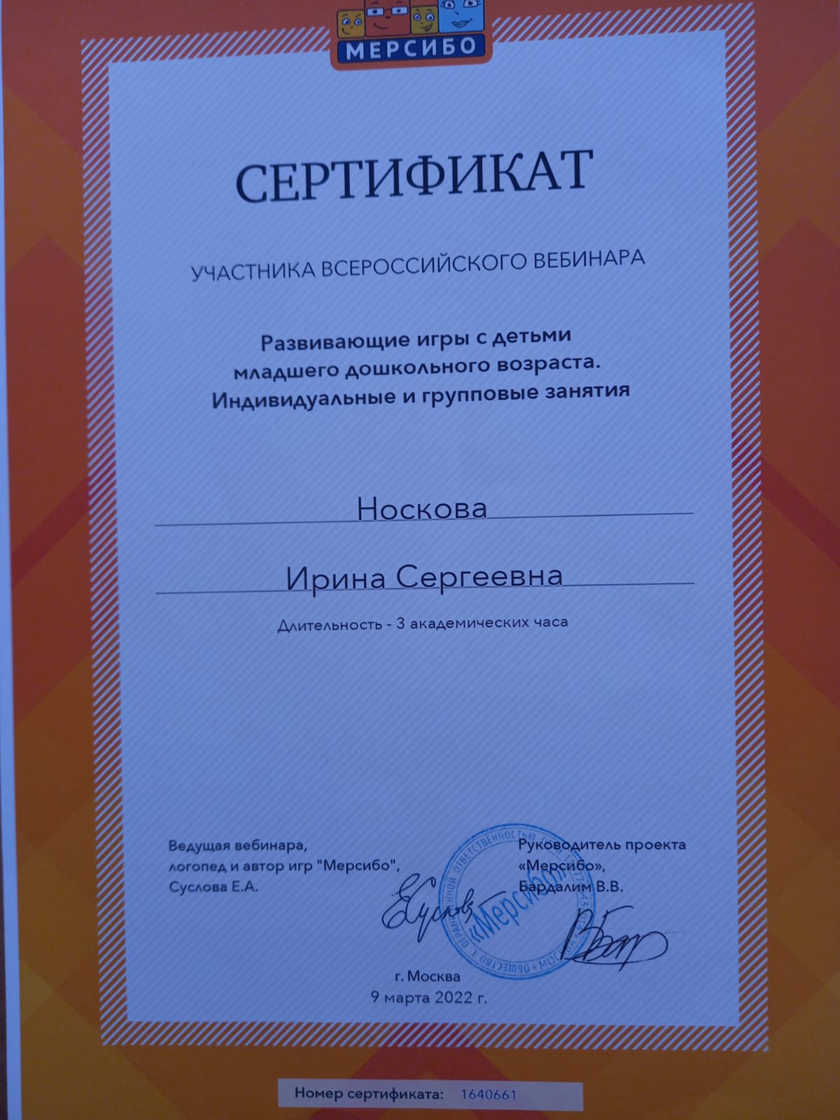 Диплом «За актуальность и социальную значимость тематики»Сертификат участника Президентской программы развития Гражданского общества «Система государственно-общественного управления в образовательной организации «Благодарность за высокие результаты в VI фестивале театральных коллективов среди учреждений дошкольного образования Индустриального районаДиплом за II место во всероссийском тестировании «Социальная адаптация детей дошкольного возраста»Почетная грамота за многолетний добросовестный труд, высокий профессионализм и в связи с празднованием Для работника дошкольного образованияСертификат, подтверждающий прохождение всероссийского тестирования по теме «Формирование сотруднических отношений между родителями и педагогами»Диплом Гран-При за высокие результаты в VI фестивале театральных коллективов среди учреждений дошкольного образования Индустриального районаСправка, подтверждающая присутствие на семинаре по теме: «Документация педагога-психолога МДОО»Сертификат участника онлайн марафона «Каждый воспитатель и учитель — психолог «Справка, подтверждающая присутствие на заседании методического объединения по теме : «Анализ работы МО педагогов-психологов МДОО за 2018-2019гг»Грамота за спортивные достижения в эстафете посвященной «НЕДЕЛЕ ЗДОРОВЬЯ»Сертификат участника вебинара «Особенности развития ребенка с СДВГ. Современный подход к пониманию проблемы»Справка, подтверждающая присутствие на семинаре-практикуме по теме: «Психолого-педагогической сопровождение детей(в том числе с ОВЗ)»Свидетельство о регистрации на международном образовательном портале Маам и является участников сетевого педагогического сообщества.Сертификат участника вебинара «Формирование произвольного внимания. Игры, упражнения и тренинги»Сертификат участника вебинара «Воспитание волевых качеств и самоконтроля у детей с СДВГ»Сертификат за участие в заседании методического объединения по теме: «Дети с ОВЗ, инвалидность в детском саду», «Деятельность психолого-педагогического консилиума образовательной организации»Сертификат за участие в семинаре по теме: «Расстройство аутистического спектра: сотрудничество в интересах ребенка»Справка слушателя за участие в онлайн методическом объединения по теме: «Реализация проектной деятельности с воспитанниками»Сертификат за участие в семинаре по теме: «Расстройство аутистического спектра или характер: как разграничить?»Сертификат участника онлайн-марафона «Сказотерапия»Справка слушателя за участие в онлайн семинаре по теме: «Организация работы ДОО с неблагополучными семьями»Диплом участника образовательного курса. Вебинар «Игры для психокоррекции недостатков личностного развития гиперактивных дошкольников»Сертификат, подтверждающий участие в установочном семинаре по итогам VI районного фестиваля детских театральных коллективов «В гостях у Тимошки»Благодарность за инициативу в распространении передового педагогического опыта дистанционным способом.