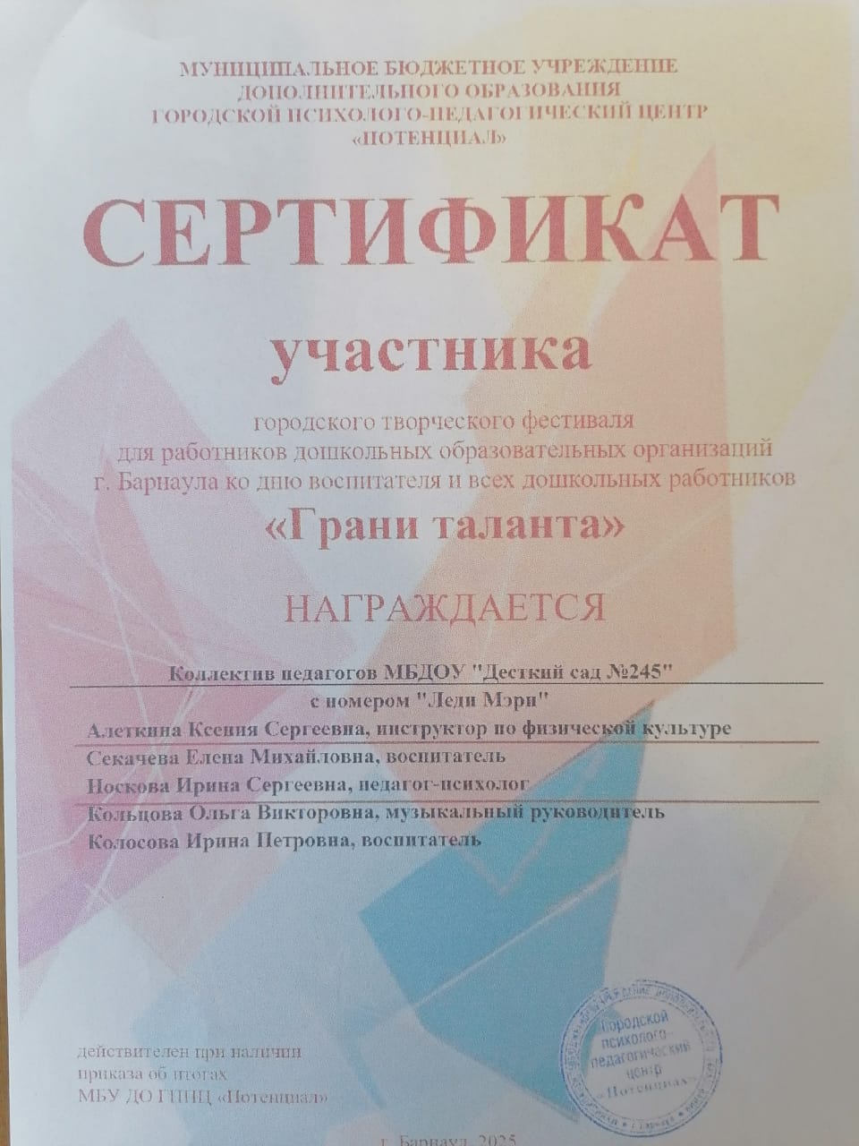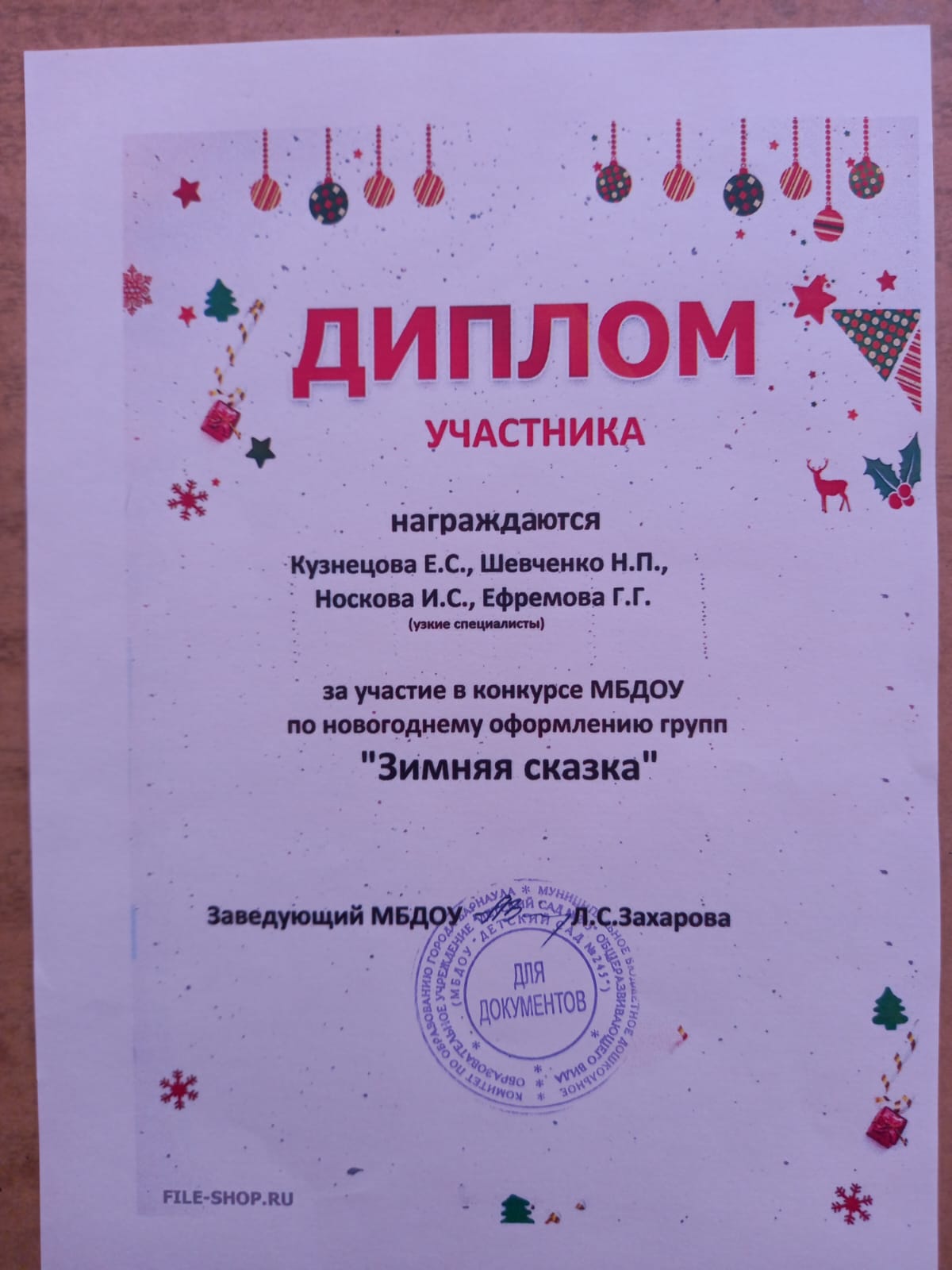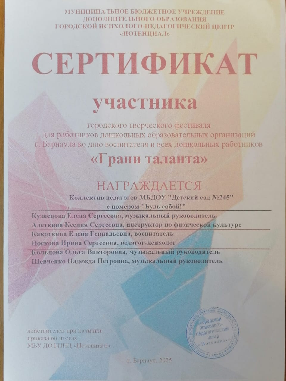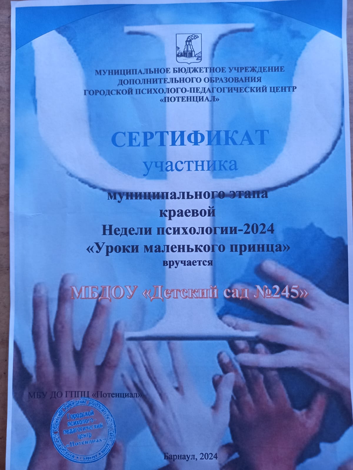 Диплом «За актуальность и социальную значимость тематики»Сертификат участника Президентской программы развития Гражданского общества «Система государственно-общественного управления в образовательной организации «Благодарность за высокие результаты в VI фестивале театральных коллективов среди учреждений дошкольного образования Индустриального районаДиплом за II место во всероссийском тестировании «Социальная адаптация детей дошкольного возраста»Почетная грамота за многолетний добросовестный труд, высокий профессионализм и в связи с празднованием Для работника дошкольного образованияСертификат, подтверждающий прохождение всероссийского тестирования по теме «Формирование сотруднических отношений между родителями и педагогами»Диплом Гран-При за высокие результаты в VI фестивале театральных коллективов среди учреждений дошкольного образования Индустриального районаСправка, подтверждающая присутствие на семинаре по теме: «Документация педагога-психолога МДОО»Сертификат участника онлайн марафона «Каждый воспитатель и учитель — психолог «Справка, подтверждающая присутствие на заседании методического объединения по теме : «Анализ работы МО педагогов-психологов МДОО за 2018-2019гг»Грамота за спортивные достижения в эстафете посвященной «НЕДЕЛЕ ЗДОРОВЬЯ»Сертификат участника вебинара «Особенности развития ребенка с СДВГ. Современный подход к пониманию проблемы»Справка, подтверждающая присутствие на семинаре-практикуме по теме: «Психолого-педагогической сопровождение детей(в том числе с ОВЗ)»Свидетельство о регистрации на международном образовательном портале Маам и является участников сетевого педагогического сообщества.Сертификат участника вебинара «Формирование произвольного внимания. Игры, упражнения и тренинги»Сертификат участника вебинара «Воспитание волевых качеств и самоконтроля у детей с СДВГ»Сертификат за участие в заседании методического объединения по теме: «Дети с ОВЗ, инвалидность в детском саду», «Деятельность психолого-педагогического консилиума образовательной организации»Сертификат за участие в семинаре по теме: «Расстройство аутистического спектра: сотрудничество в интересах ребенка»Справка слушателя за участие в онлайн методическом объединения по теме: «Реализация проектной деятельности с воспитанниками»Сертификат за участие в семинаре по теме: «Расстройство аутистического спектра или характер: как разграничить?»Сертификат участника онлайн-марафона «Сказотерапия»Справка слушателя за участие в онлайн семинаре по теме: «Организация работы ДОО с неблагополучными семьями»Диплом участника образовательного курса. Вебинар «Игры для психокоррекции недостатков личностного развития гиперактивных дошкольников»Сертификат, подтверждающий участие в установочном семинаре по итогам VI районного фестиваля детских театральных коллективов «В гостях у Тимошки»Благодарность за инициативу в распространении передового педагогического опыта дистанционным способом.