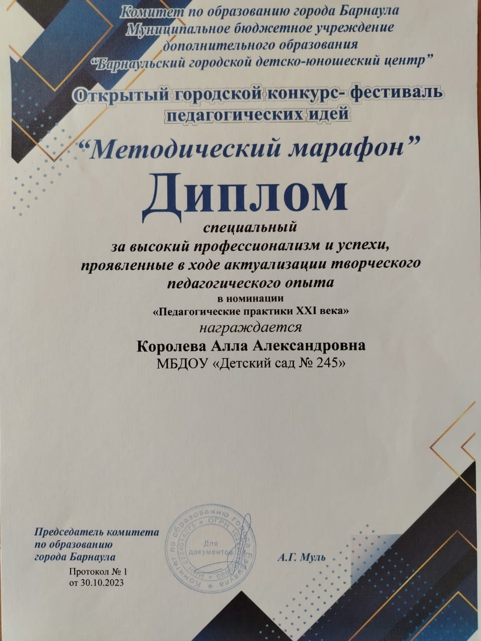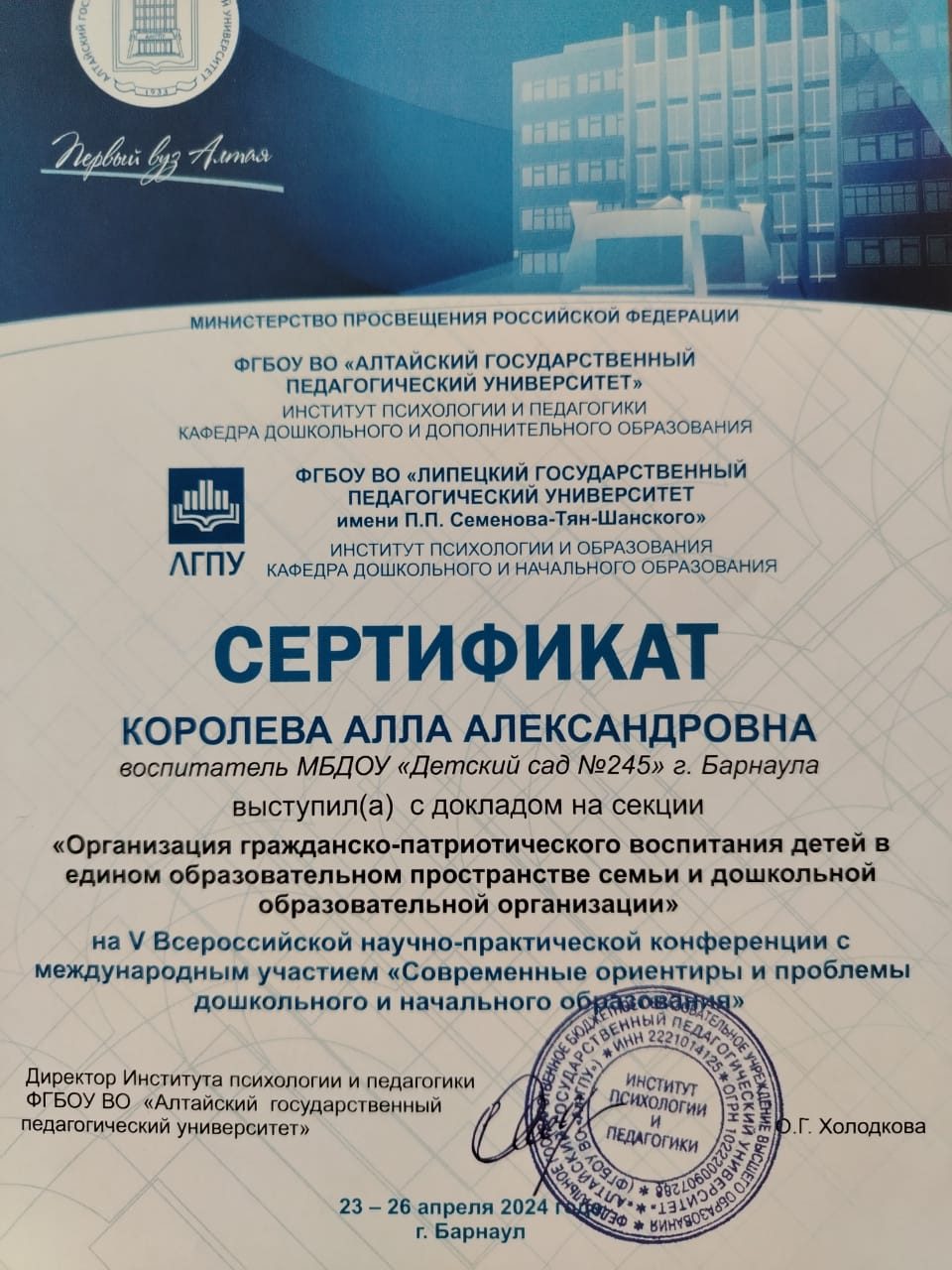 Институт дополнительного образования ФГБОУ ВО «АлтГПУ» тема «Основные условия и направления реализации федеральной образовательной программы дошкольного образования» октябрь 2024г., 72 ч.